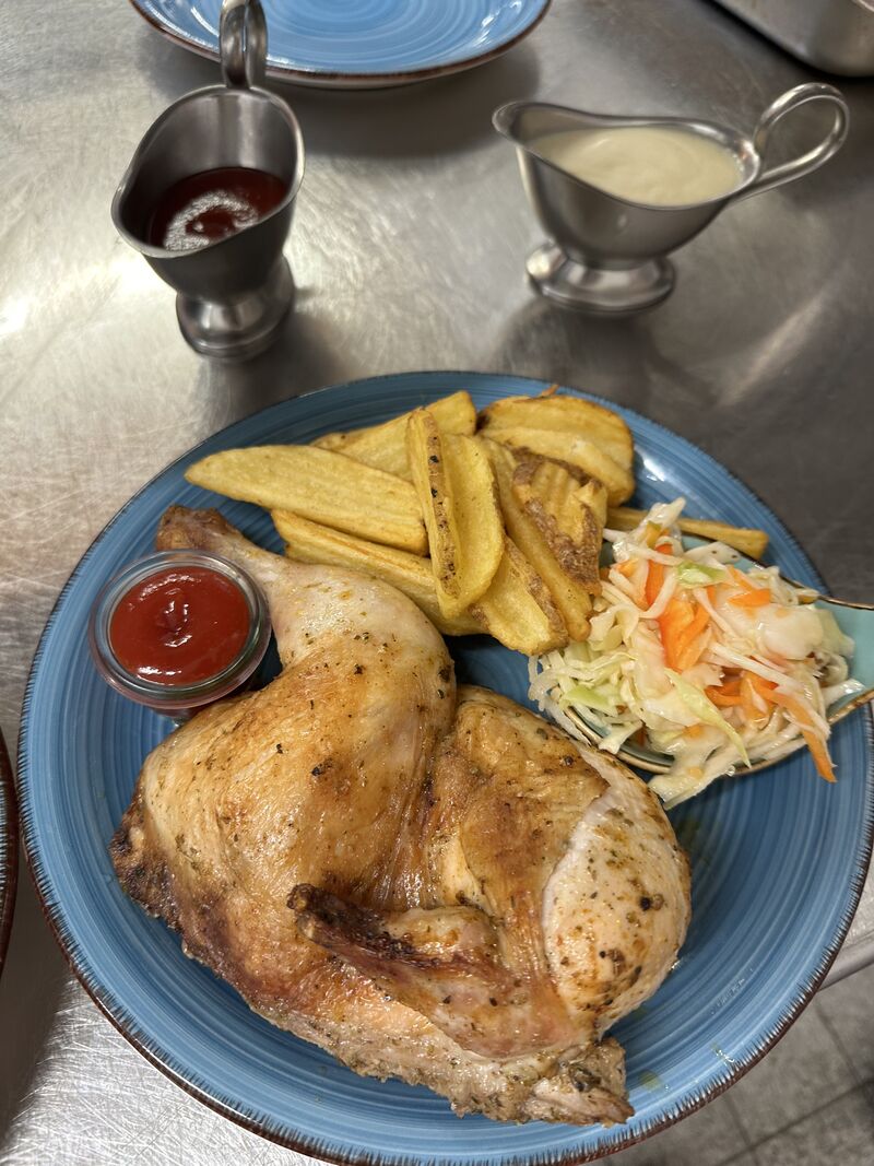 Maishähnchen mit Rosenkohl und Herzoginkartoffeln